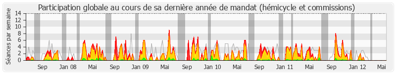 Présences relevées Participations Mots prononcés (x 10 000) Vacances parlementaires — Présence médiane Explications