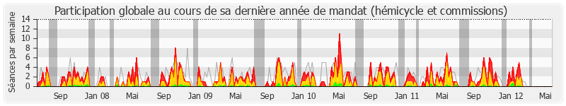 Présences relevées Participations Mots prononcés (x 10 000) Vacances parlementaires — Présence médiane Explications